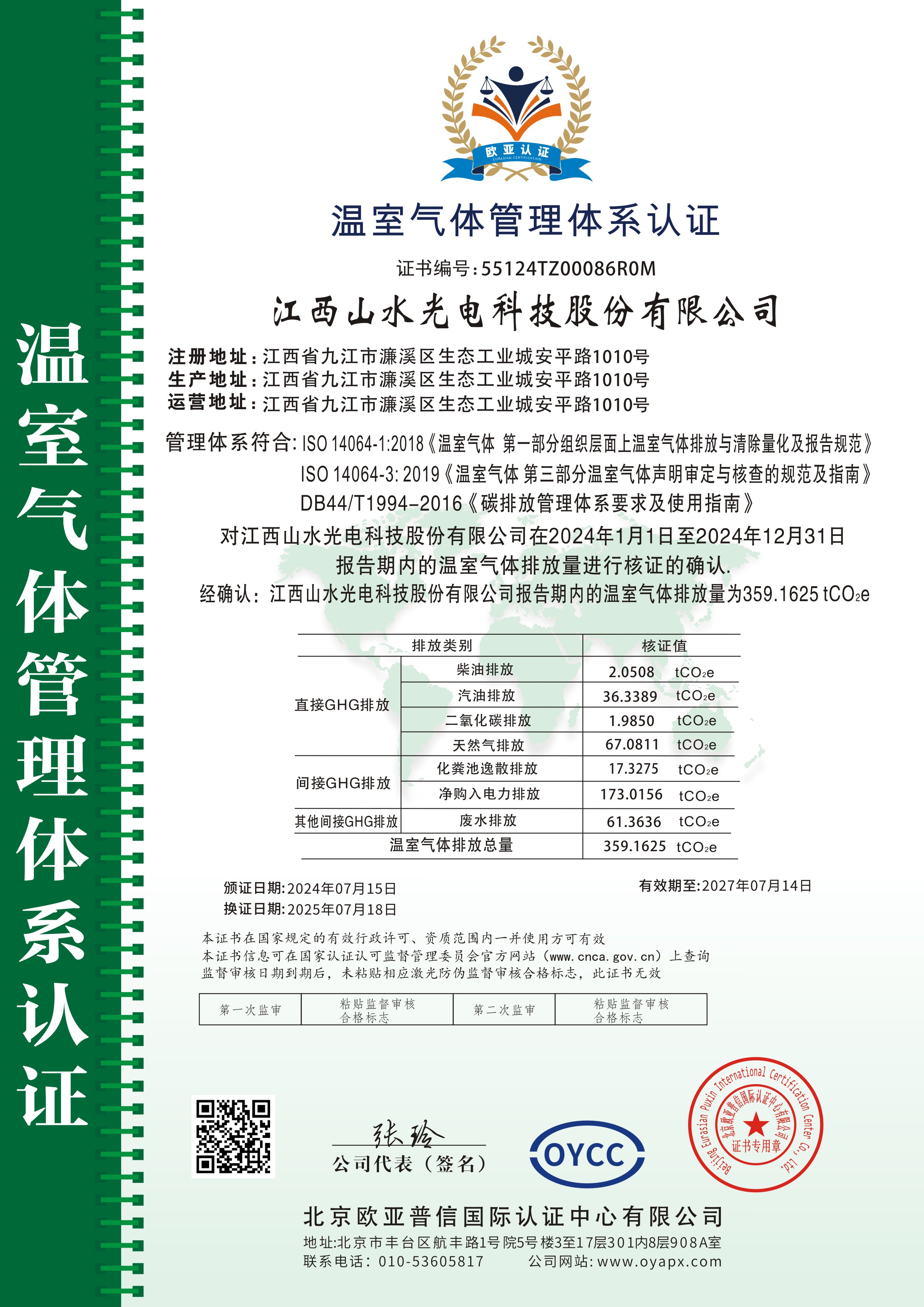 江西山水光電科技股份有限公司2024年度溫室氣體已通過北京歐亞普信國際認證中心核查并認證,相關(guān)證書和報告如下: